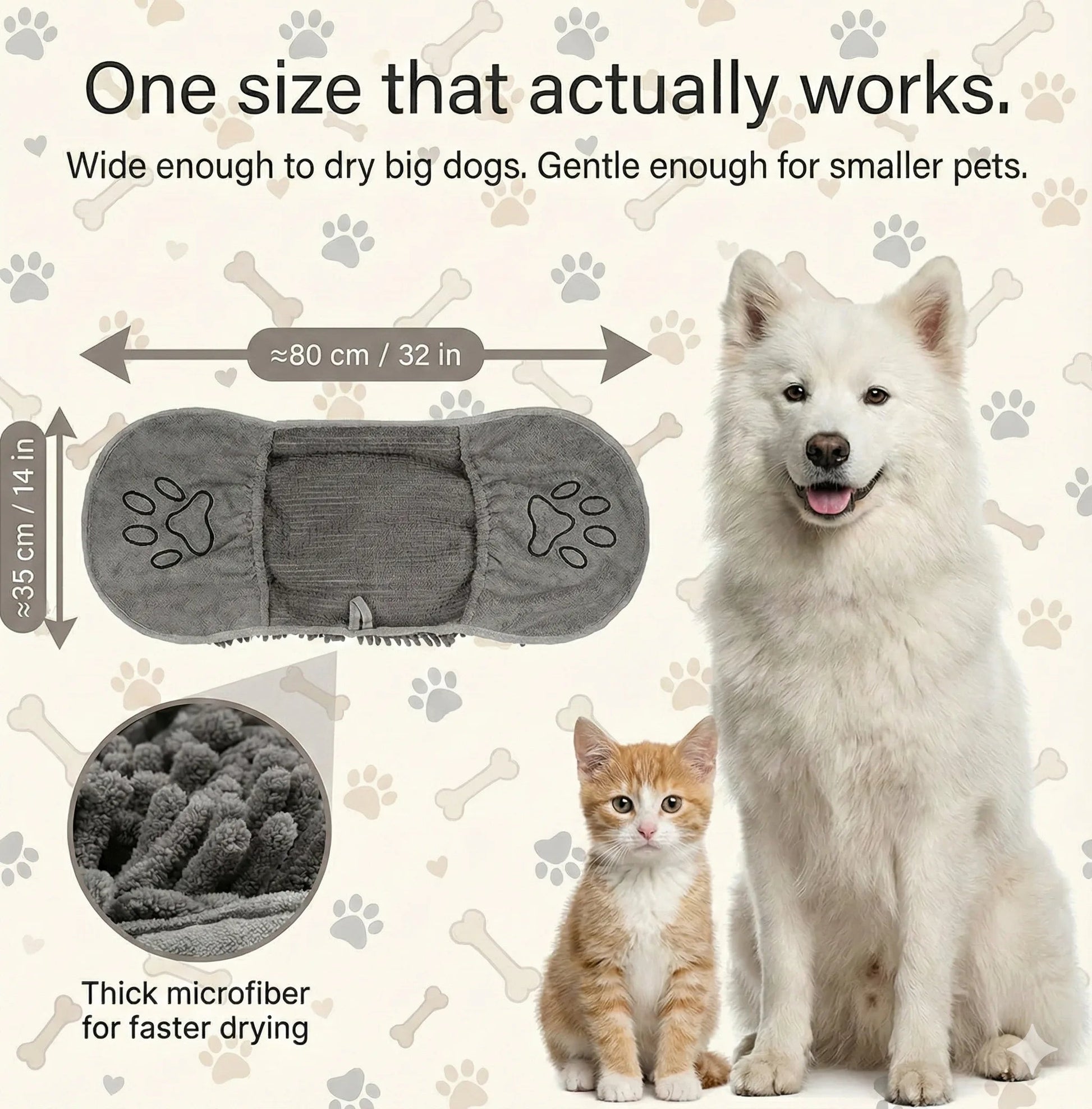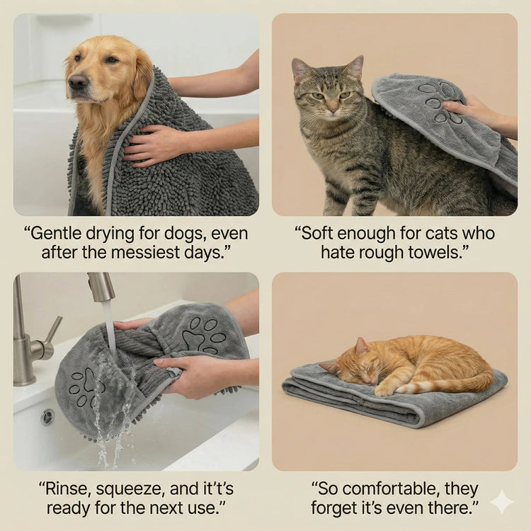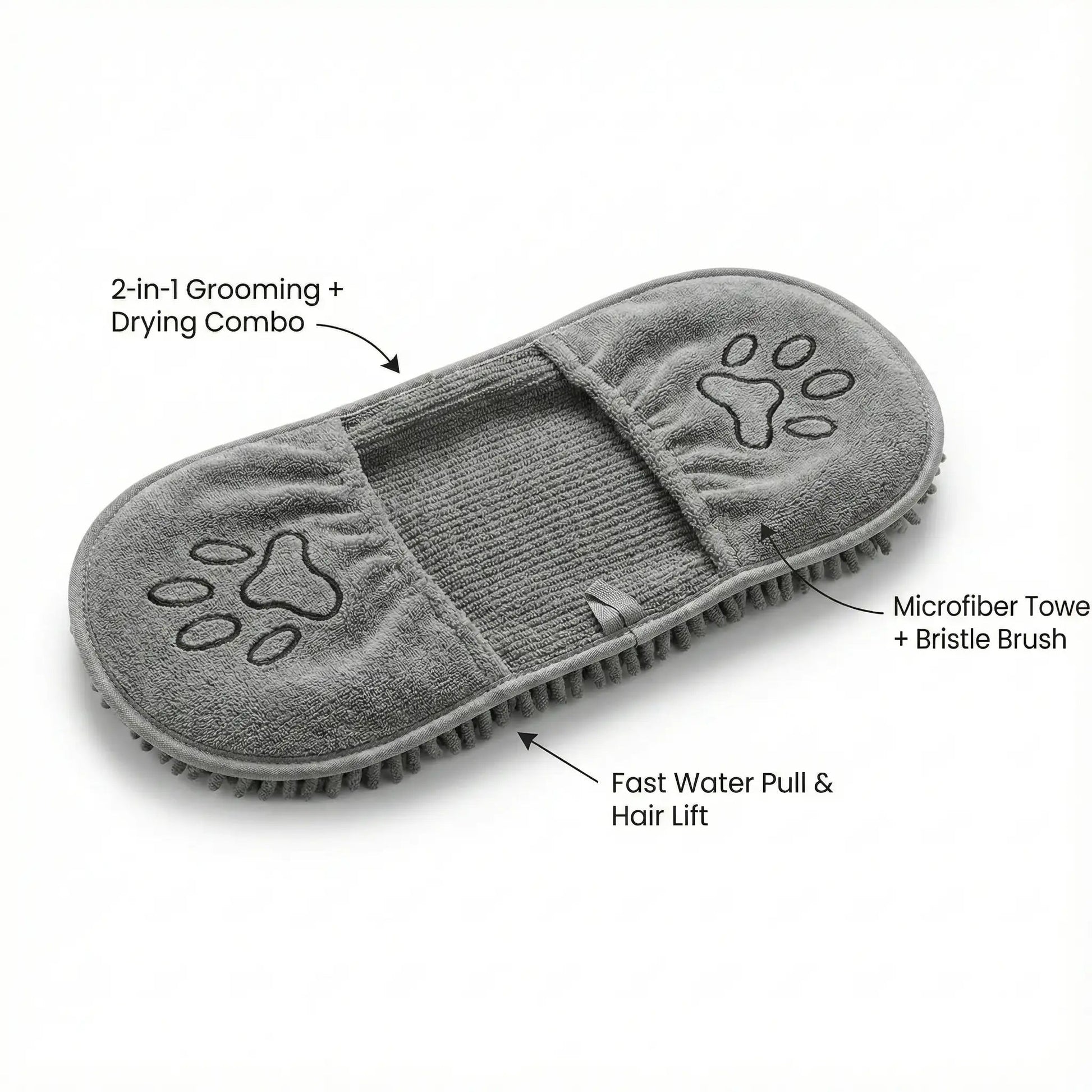 - Dual-action brush and towel - Super-absorbent for quick dry - Gentle massage soothes pets