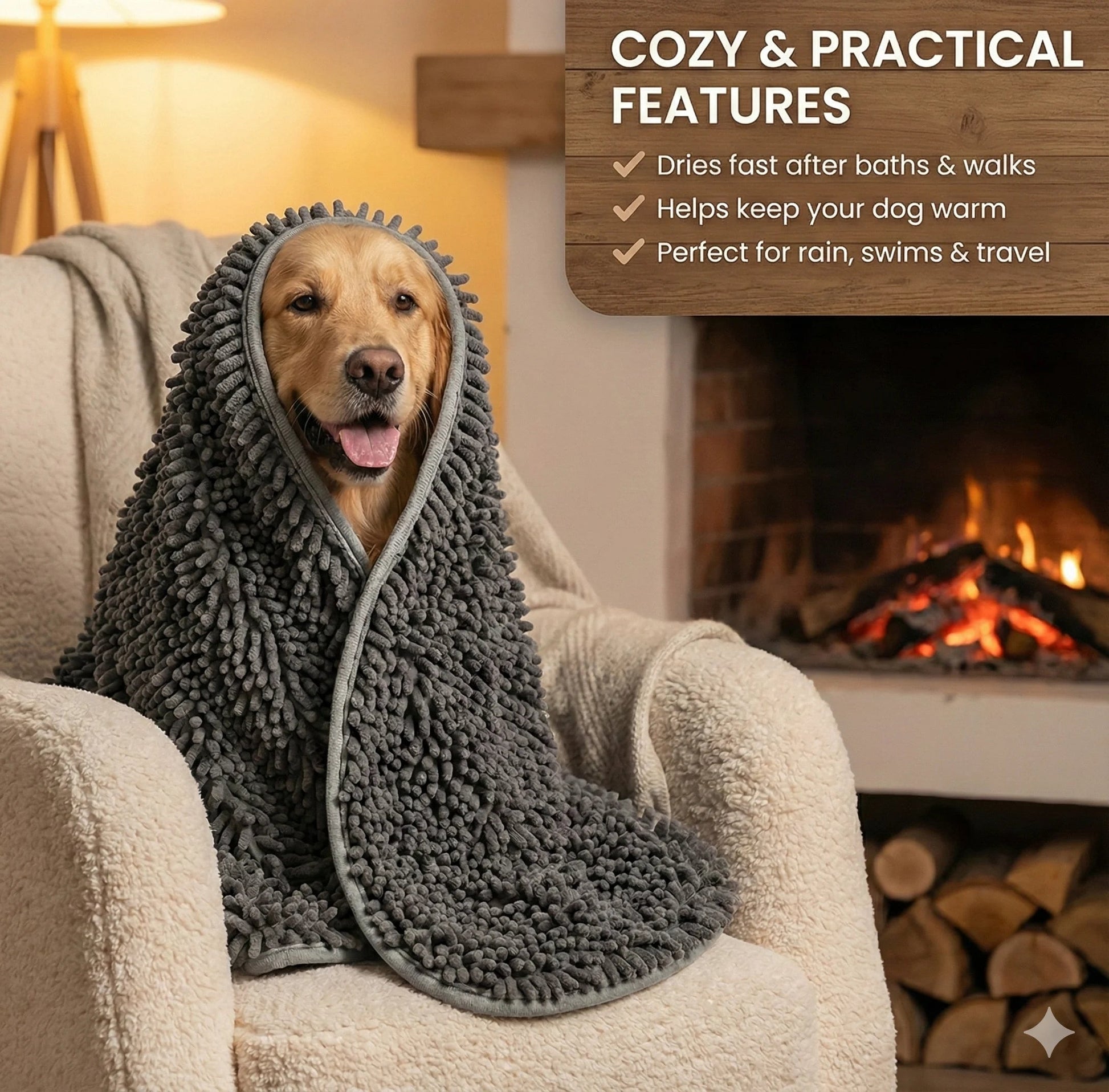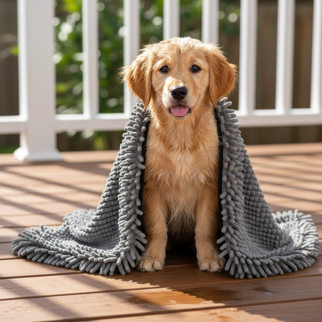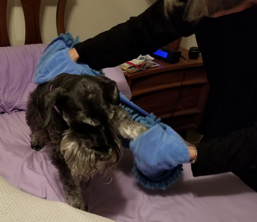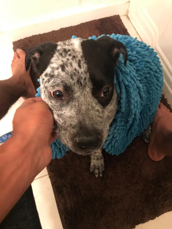 - Dual-action brush and towel - Super-absorbent for quick dry - Gentle massage soothes pets